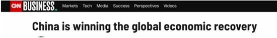 美國(guó)有線(xiàn)電視新聞網(wǎng)認(rèn)為,中國(guó)政府通過(guò)嚴(yán)格的封鎖以及追蹤病毒攜帶者路徑的措施阻止了新冠病毒的傳播,發(fā)放消費(fèi)券刺激民眾支出,云南、河南、四川、重慶、陜西和河北七省市推出了25萬(wàn)億元重點(diǎn)“新基建”項(xiàng)目,實(shí)現(xiàn)了相對(duì)較快的經(jīng)濟(jì)恢復(fù)。在中國(guó)的國(guó)慶“黃金周”期間,旅游業(yè)消費(fèi)有所回升。