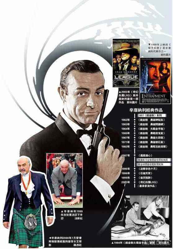 辛康納利亦參演《偷天陷阱》、《追擊赤色十月》等,并憑藉《義膽雄心》一片,1988年奪得奧斯卡最佳男配角。他還兩次獲得英國電影學(xué)院獎(jiǎng),以及三次金球獎(jiǎng)。2003年的《奇幻兵團(tuán)LXG》據(jù)信是他最后一部作品。