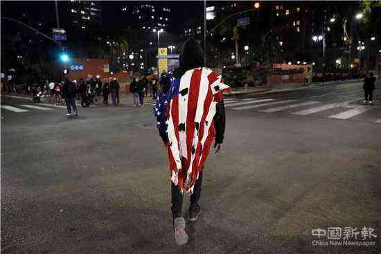 △在洛杉磯,一名男子身披被燒毀的美國國旗(圖片來源:美聯(lián)社)