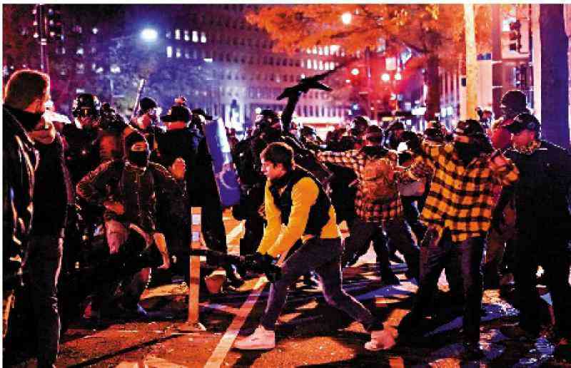 12日,數(shù)千特朗普支持者在華府聚集,高喊“再干4年”、“停止竊取(選舉)”等口號(hào),極右翼組織“驕傲男孩”亦出現(xiàn)在人群中。特朗普在推特表示支持,并在搭乘直升機(jī)前往紐約看球賽的途中,三次飛過(guò)人群上方,引起陣陣歡呼。當(dāng)日,“特粉”、反特人士和警方多次發(fā)生沖突,至少23人被捕。國(guó)會(huì)大廈附近發(fā)生一宗槍擊事件,導(dǎo)致一人受傷;4人被刺傷,且傷勢(shì)嚴(yán)重;另有兩名警員受傷。