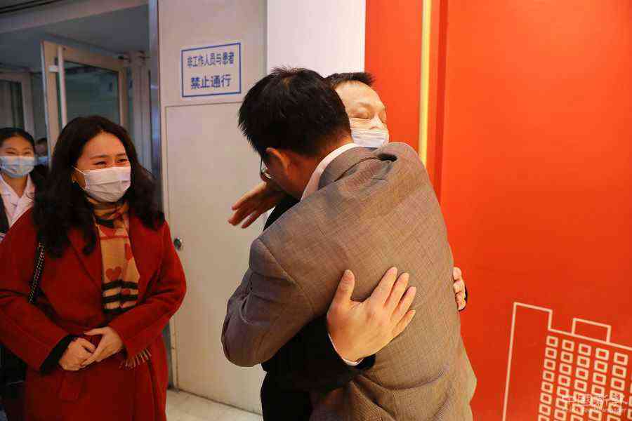 12月6日,武漢醫(yī)生易凡(中)與當(dāng)時參與他救治的醫(yī)生、中日友好醫(yī)院呼吸與危重癥學(xué)科主任詹慶元見面擁抱。 中國日報記者 朱興鑫 攝