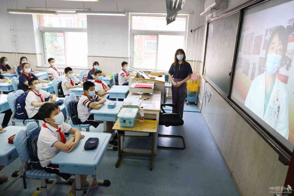 6月1日,在北京對(duì)外經(jīng)濟(jì)貿(mào)易大學(xué)附屬小學(xué),學(xué)生們?cè)诼爣?guó)家援鄂醫(yī)療隊(duì)醫(yī)生講述抗疫故事。 中國(guó)日?qǐng)?bào)記者 朱興鑫 攝