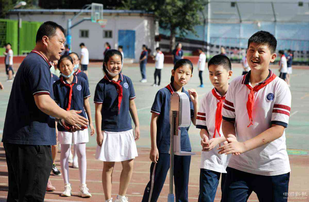 6月1日,在北京對(duì)外經(jīng)濟(jì)貿(mào)易大學(xué)附屬小學(xué),學(xué)生們參加課間鍛煉后進(jìn)行手部消毒。中國(guó)日?qǐng)?bào)記者 朱興鑫 攝