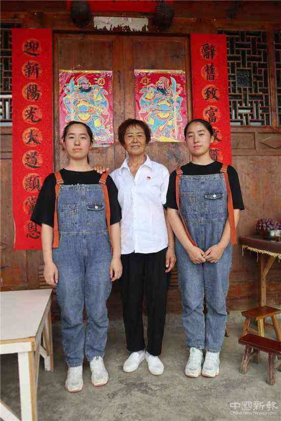 (雙胞胎姐妹與關(guān)心她們的村支書(shū)廖世英合影)