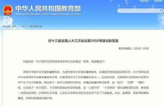 13日,教育部網(wǎng)站發(fā)布的《對(duì)十三屆全國(guó)人大三次會(huì)議第3950號(hào)建議的答復(fù)》(以下簡(jiǎn)稱《答復(fù)》),披露了教育部答復(fù)十三屆全國(guó)人大三次會(huì)議“關(guān)于規(guī)范漢語(yǔ)用語(yǔ)承續(xù)傳統(tǒng)文化的建議”的具體內(nèi)容。