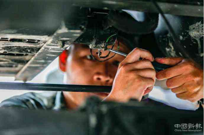 汽車修理專業(yè)課目中,一名參賽官兵正在維修故障車輛。
