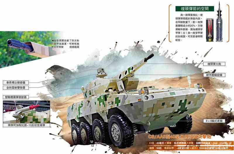 中國自主研發(fā)的CS/AA5型40毫米埋頭彈突擊炮,所發(fā)射的埋頭彈以小口徑實現(xiàn)了大威力,在體積和重量減輕30%的同時,與同口徑的傳統(tǒng)彈藥相比,穿甲能力卻提高40%,彈芯以4倍音速沖向目標,同時高達上千攝氏度的碎片向四周造成密集殺傷,是打擊重型裝甲車和主戰(zhàn)坦克等地面重裝甲力量的新型利器。