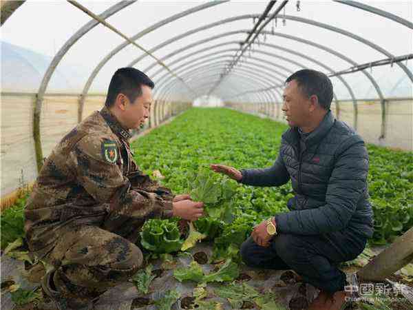 昆明市尋甸縣人武部政委方振宇向七星村種植大戶常民冬了解生菜種植銷售情況。張軍 攝
