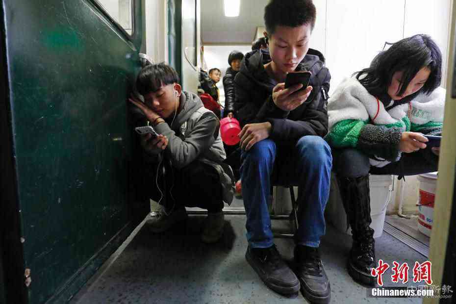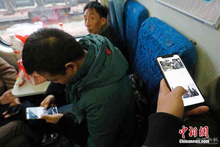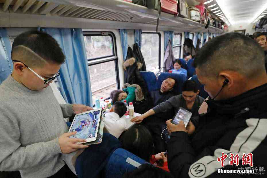 1月18日,在上海開往成都的K4663次列車上,旅客們正通過手機(jī)、iPad等移動(dòng)設(shè)備,度過長(zhǎng)達(dá)42小時(shí)的回家路。2020年春運(yùn)中,平均時(shí)速120公里的綠皮車依然承擔(dān)著巨大任務(wù)。中新社記者 殷立勤 攝