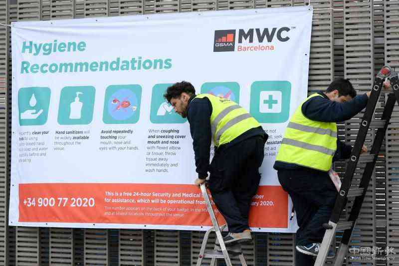 圖:工人12日在MWC場館外懸掛有關(guān)衛(wèi)生建議的橫幅\法新社