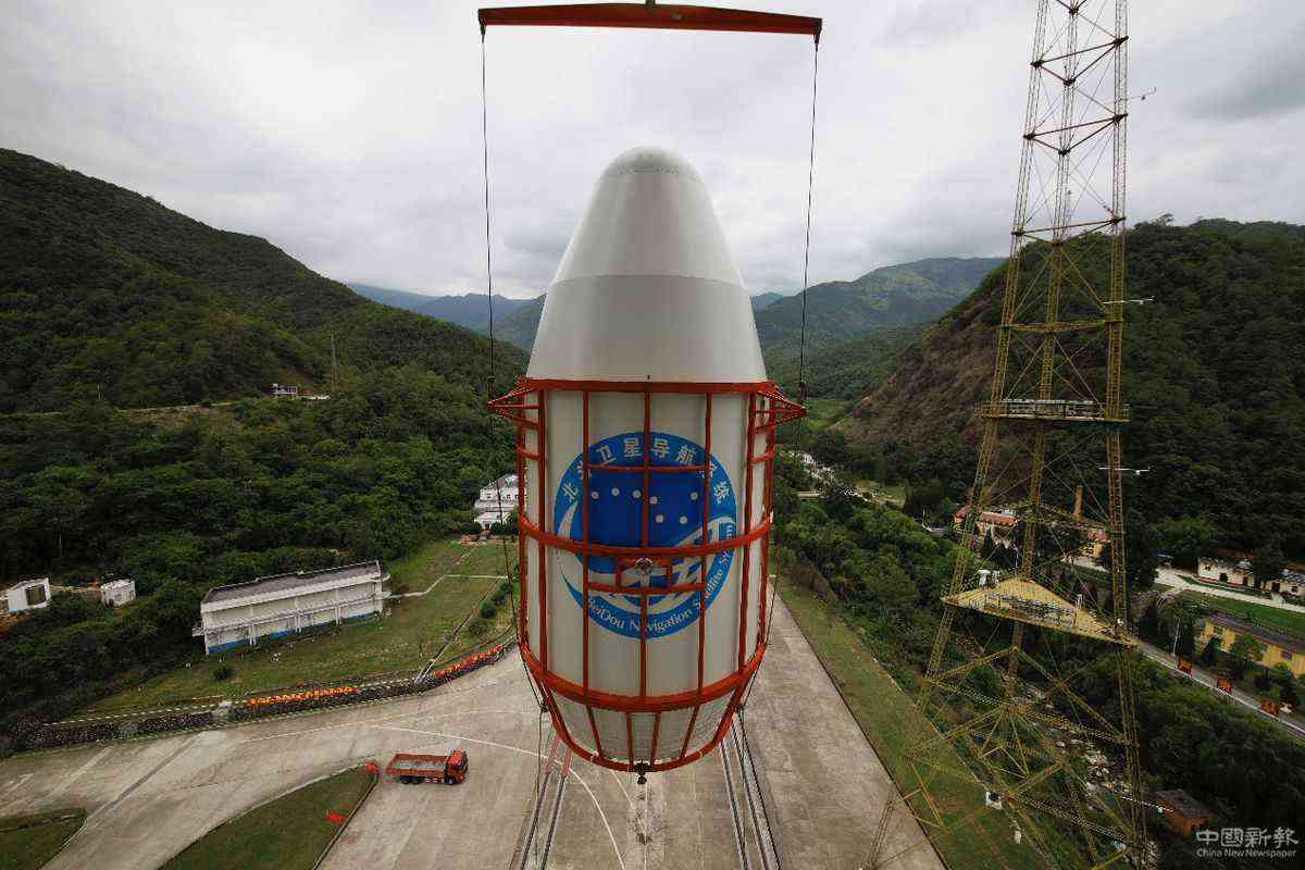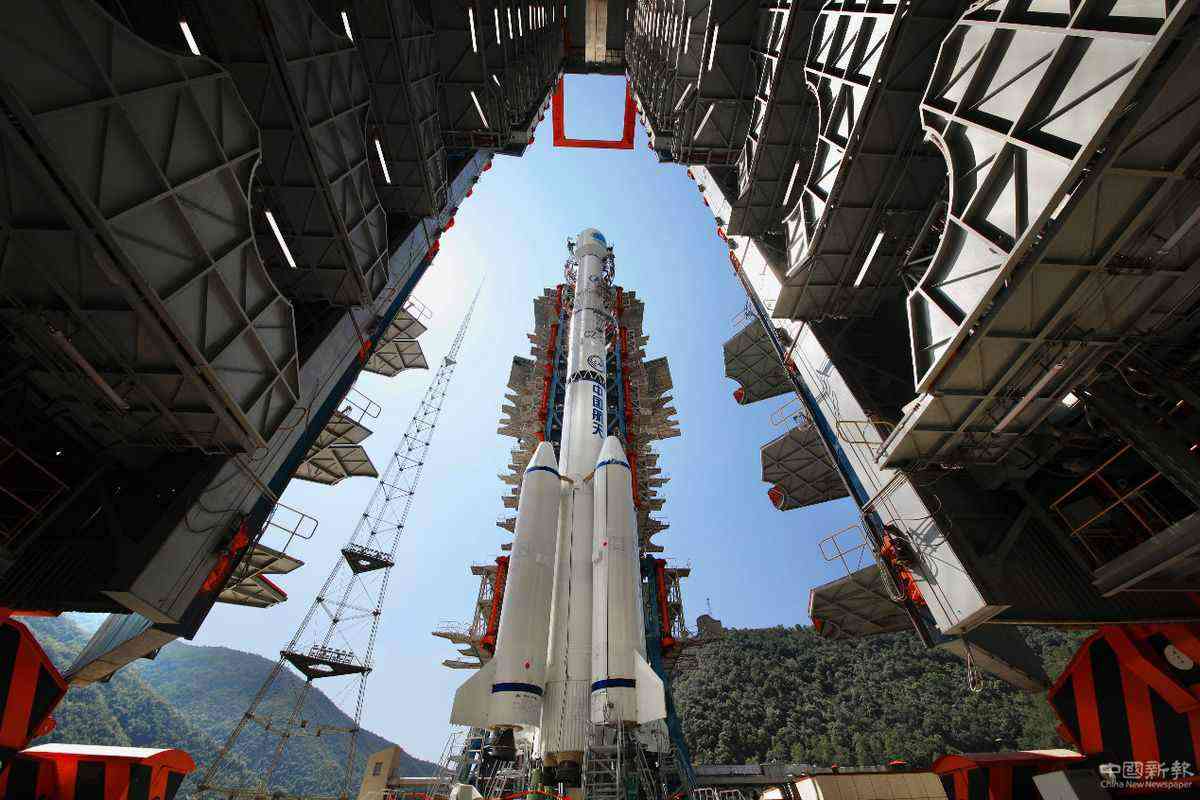 執(zhí)行發(fā)射任務(wù)的長征三號乙運載火箭矗立在西昌衛(wèi)星發(fā)射中心的塔架上。航天科技集團一院供圖