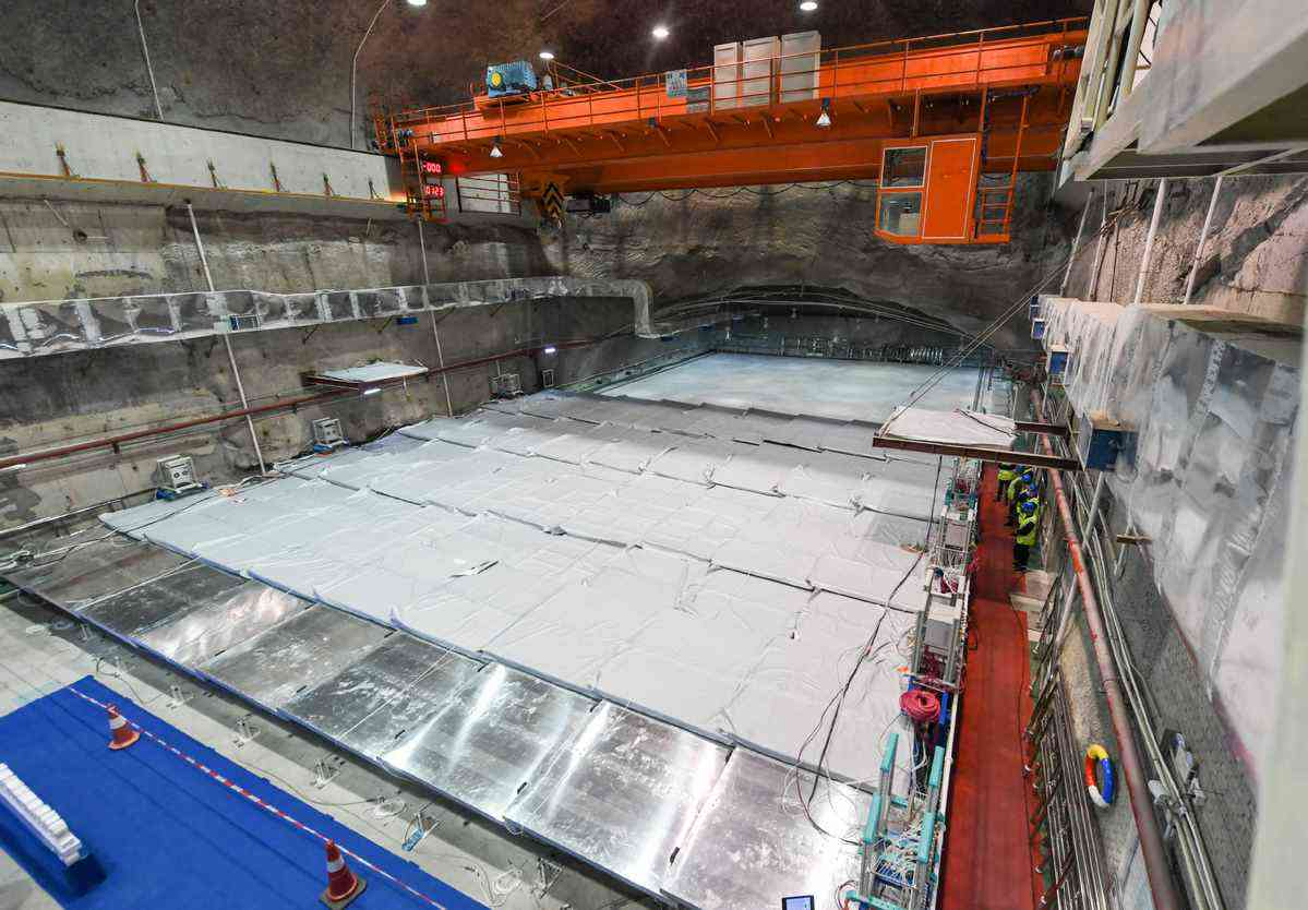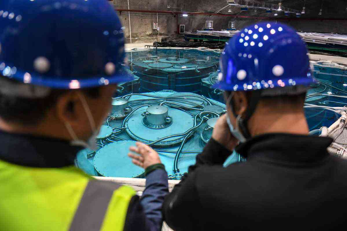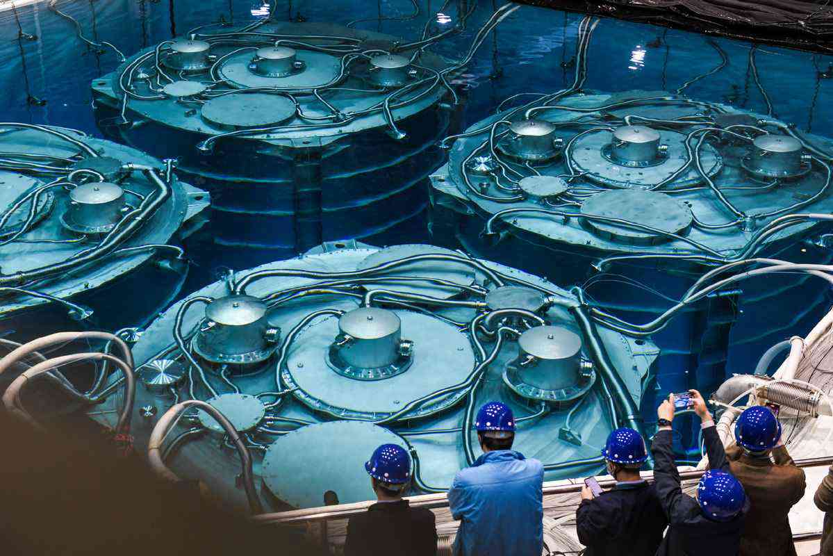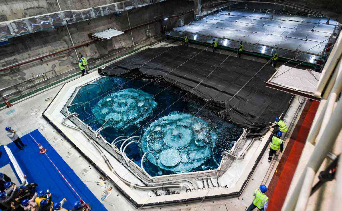 實驗大廳的水池外罩被打開,展現(xiàn)出沉浸在碧藍色高純水中的4個中微子探測器。之后,這里將按計劃進行設備拆卸撤場工作,預計在半年內(nèi)完成。