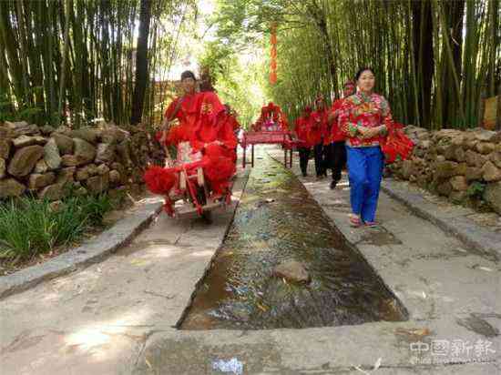 走進(jìn)竹泉村,宋代朱熹的詩(shī)句形容最合適不過(guò)“勝日尋芳泗水濱,無(wú)邊光景一時(shí)新。等閑識(shí)得東風(fēng)面,萬(wàn)紫千紅總是春。”綠油油竹林、山泉流水清澈透明,如同一幅世外桃源美圖。竹泉村的美并非如此簡(jiǎn)單,景美人更美。坐落在村中的房屋,很好的保留了沂蒙當(dāng)?shù)靥赜械娘L(fēng)貌。娶親、接親的風(fēng)俗表演,還原了當(dāng)?shù)仫L(fēng)俗風(fēng)貌。紅花衣,新娘紅蓋頭,新郎用推車載著新娘,鼓樂(lè)齊鳴喜氣洋洋。
