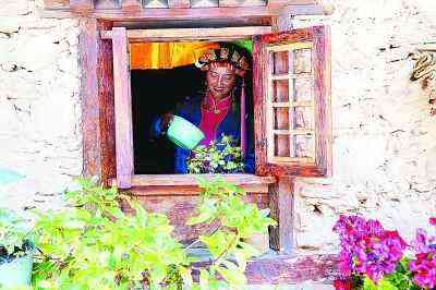 鄉(xiāng)村振興讓四川省甘孜州丹巴縣甲居藏寨越來(lái)越美麗,圖為甲居鎮(zhèn)甲居一村村主任唐秀英在澆花。本報(bào)記者閆匯芳攝
