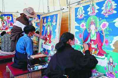 6月13日,四川省藏文學(xué)校職業(yè)教育爐霍實(shí)訓(xùn)基地唐卡繪畫(huà)班的學(xué)生們正在繪制自己的畢業(yè)作品。本報(bào)記者閆匯芳攝