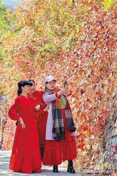 10月15日,房山周口店坡峰嶺,游客在紅葉旁自拍。記者 李凱祥