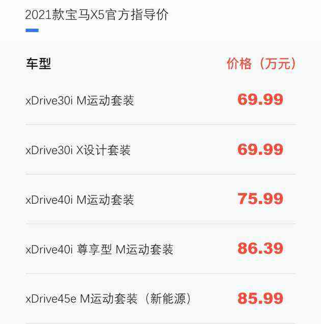 日前,我們從寶馬官方渠道獲悉,2021款寶馬X5 、X5新能源車型上市,售價(jià)為69.99-86.39萬元,據(jù)了解2021款X5相較現(xiàn)款車型在部分配置上有所改動(dòng),動(dòng)力方面將搭載2.0T四缸渦輪增壓發(fā)動(dòng)機(jī)與3.0T直列六缸渦輪增壓發(fā)動(dòng)機(jī),具體售價(jià)如下: