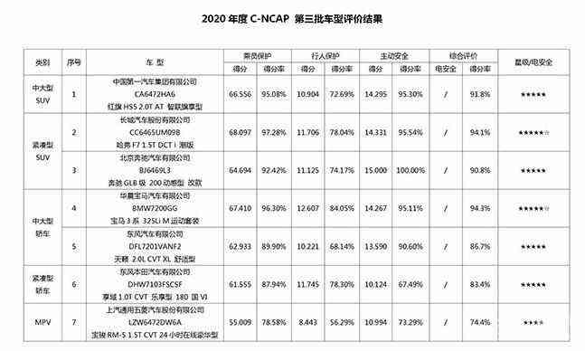截至2020年10月底,2020年度第三批8款車型的C-NCAP評價試驗全部完成。11月21日,中國汽車技術研究中心有限公司(簡稱“中汽中心”)在廣州發(fā)布了其中7款車型的評價結果。其中,鑒于近期理想ONE涉及了召回,本著對消費者負責的原則,測評管理中心將進一步確認相關信息。