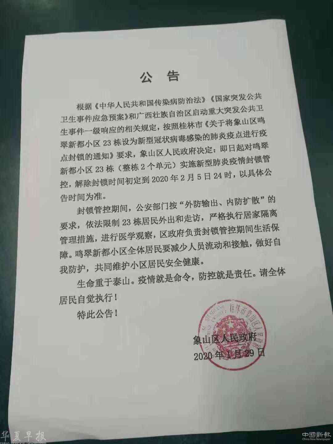 華夏早報(bào)-燈塔新聞?dòng)浾呓裉欤?月30日)從桂林市象山區(qū)人民政府證實(shí)了此事,1月29日晚上,象山區(qū)新型冠狀病毒感染的肺炎防控指揮部召開會(huì)議,按照桂林市《關(guān)于將象山區(qū)鳴翠新都小區(qū)23棟設(shè)為新型冠狀病毒感染的肺炎疫點(diǎn)進(jìn)行疫點(diǎn)封鎖的通知》要求,象山區(qū)人民政府決定,即日起將象山區(qū)鳴翠新都小區(qū)23棟(整棟2個(gè)單元)封鎖管控,解除封鎖管控時(shí)間初定于2月5日24時(shí),以具體公告時(shí)間為準(zhǔn)。