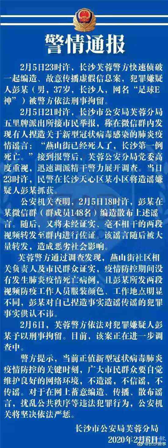 2月5日晚上9時(shí)許,長(zhǎng)沙市公安局芙蓉分局五里牌派出所接市民舉報(bào),稱在微信群內(nèi)發(fā)現(xiàn)有人捏造關(guān)于新型冠狀病毒感染的肺炎疫情謠言:" 燕山街已經(jīng)死人了,長(zhǎng)沙第一例死亡。" 接到報(bào)警后,芙蓉公安分局黨委高度重視,迅速調(diào)派精干警力展開(kāi)調(diào)查。當(dāng)晚11時(shí)許,民警在長(zhǎng)沙天心區(qū)某小區(qū)將造謠嫌疑人彭某抓獲。