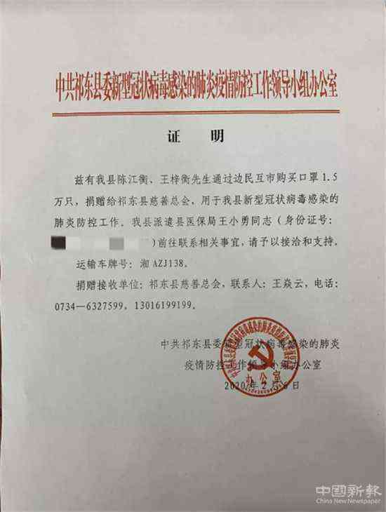 由于急需,王梓衡跟御送物流負責人劉明聯(lián)系,說老家祁東派車到廣西憑祥取。從湖南祁東到廣西憑祥有一千公里路程。大年十三,“中共祁東縣委新型新型冠狀病毒感染的疫情防控工作領(lǐng)導(dǎo)小組辦公室”派出縣醫(yī)保局干部王小勇驅(qū)車前往廣西憑祥取口罩。