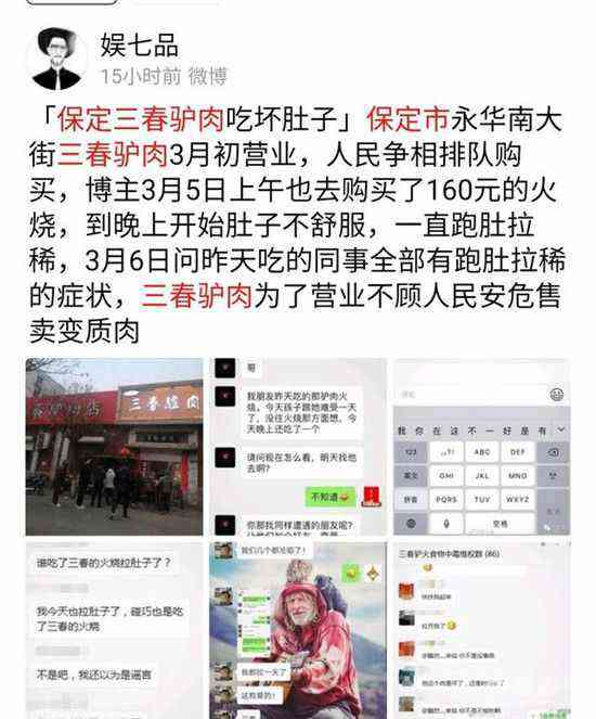 中國(guó)新報(bào)河北保定訊(記者 鄭平)連日來(lái),河北保定的朋友圈里熱傳保定市蓮池區(qū)“三春”驢肉店出售變質(zhì)的驢肉火燒,吃壞了不少消費(fèi)者,還有不少消費(fèi)者組建了維權(quán)群。今天(3月7日)下午,記者看到了蓮池區(qū)委宣傳部針對(duì)網(wǎng)絡(luò)傳播的相關(guān)輿情發(fā)布的說(shuō)明。