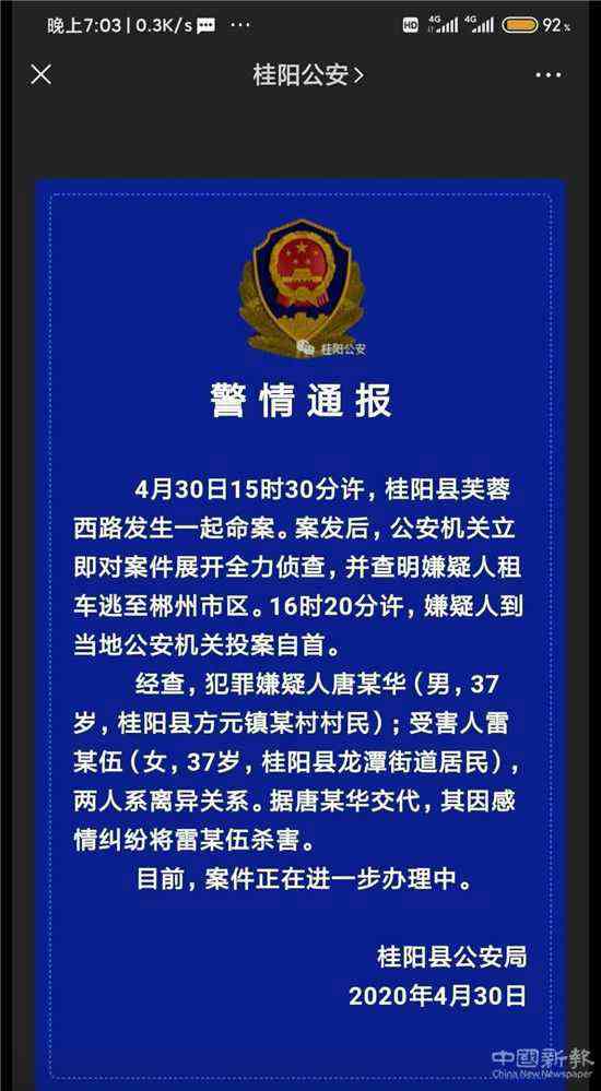 郴州桂陽發(fā)生兇殺案:前夫殺害前妻后投案自首