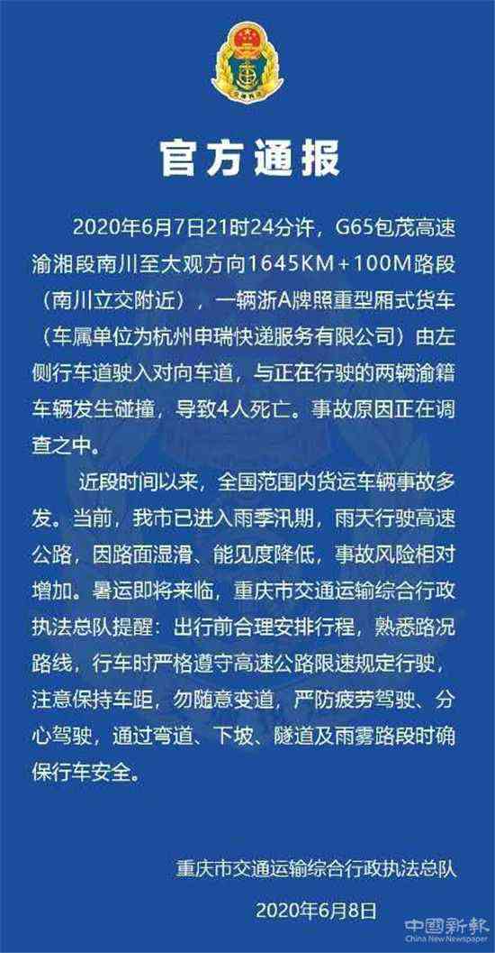 中國新報(記者 黃金華)記者從重慶市交通運輸綜合行政執(zhí)法總隊了解到,2020年6月7日21時24分許,G65包茂高速渝湘段南川至大觀方向1645KM+100M路段(南川立交附近),一輛浙A牌照重型廂式貨車(車屬單位為杭州申瑞快遞服務(wù)有限公司)由左側(cè)行車道駛?cè)雽ο蜍嚨?,與正在行駛的兩輛渝籍車輛發(fā)生碰撞,導(dǎo)致4人死亡。事故原因正在調(diào)查之中。