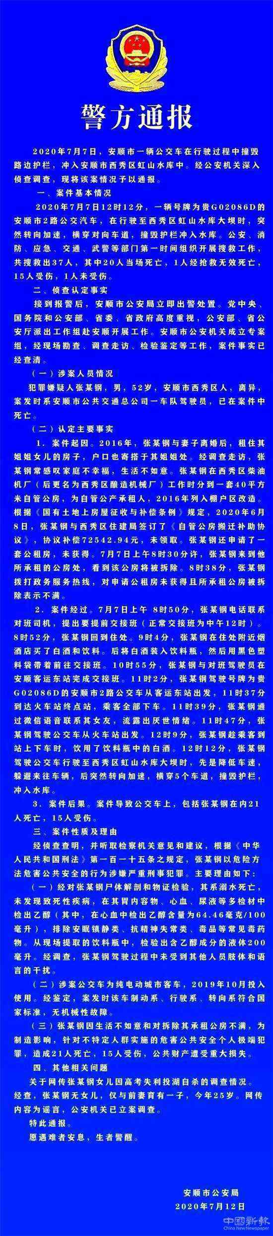 中國新報(記者 劉鵬飛)2020年7月7日中午12時許,安順市一輛公交車在行駛過程中撞壞湖邊護欄,墜入安順市西秀區(qū)虹山水庫中。事件發(fā)生后,公安部、應(yīng)急管理部等國家有關(guān)部門及省、市迅速組成調(diào)查組開展縝密調(diào)查,現(xiàn)將有關(guān)情況通報如下: