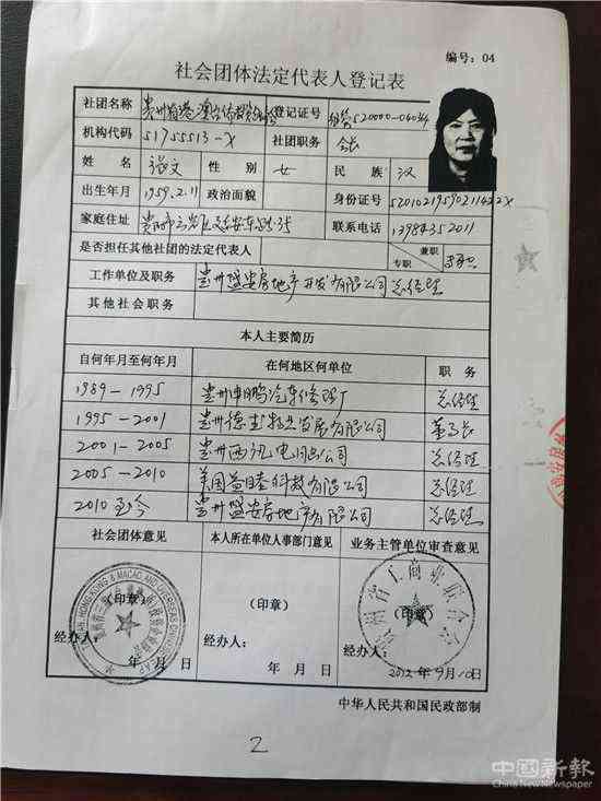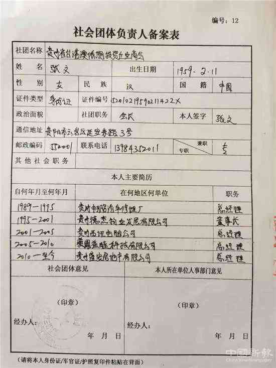 2012年9月12日張文向民政部門提交的《社會團體法定代表人登記表》、《社會團體負責人備案表》中工作單位填寫的是貴州盛安房地產(chǎn)開發(fā)有限公司,本人主要簡歷職務(wù)欄填寫的內(nèi)容為:從2010年至今任貴州盛安房地產(chǎn)開發(fā)有限公司總經(jīng)理,本人所在單位人事部門意見一欄沒有填寫任何內(nèi)容,留為空白。