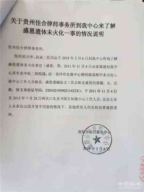 張文以盛恩“遺孀”身份一直將盛恩尸體存放于貴陽市景云山殯儀館,并分別于2011年11月4日、2015年7月28日通知貴陽市景云山殯儀館在她本人未親自出面并簽字同意的情況下,其他所有人均無權(quán)處置盛恩遺體。