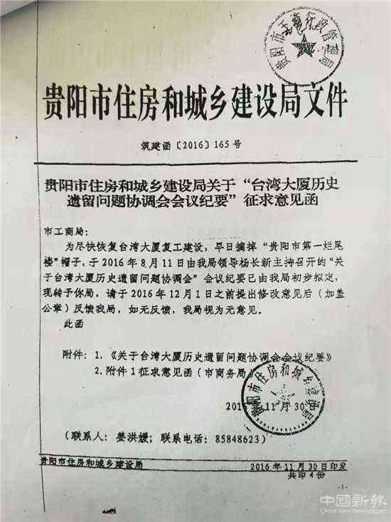 2017年11月27日,貴陽市人民政府第16次常務(wù)會議“將臺灣大廈列為首批解決的歷史遺留問題”。