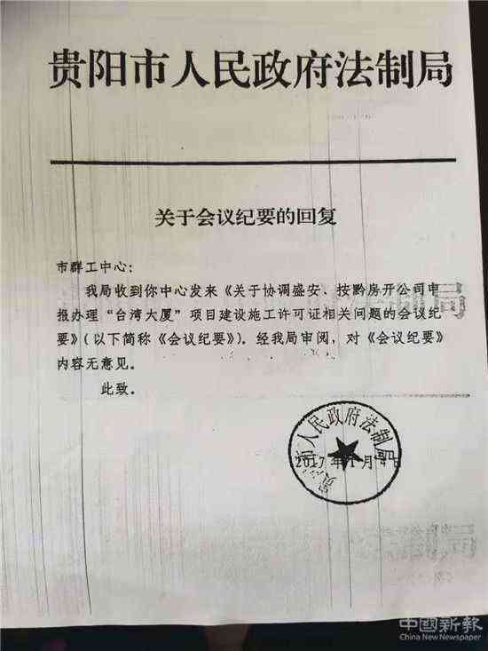 從盛安房地產(chǎn)公司提供的資料看,2016年8月11日、12月13日,貴陽市住建局、市群工中心會議紀要顯示貴陽市工商局、市商務(wù)局、市法制局同意給臺灣大廈頒發(fā)施工、預售許可證。