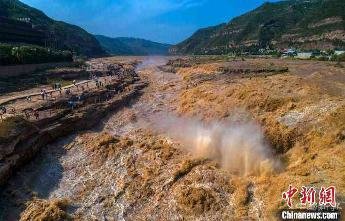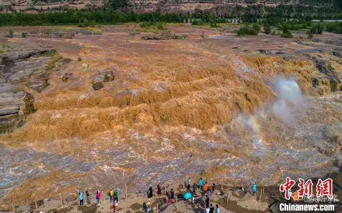 主副瀑布連成一片,游客在壺口瀑布岸邊觀賞游覽?!√m華 攝