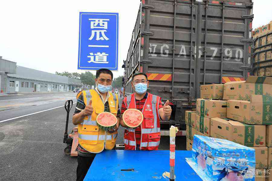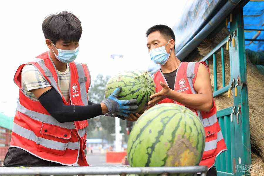 進(jìn)入新發(fā)地市場(chǎng)的商戶在展示新鮮的西瓜。(攝影:王成孟)