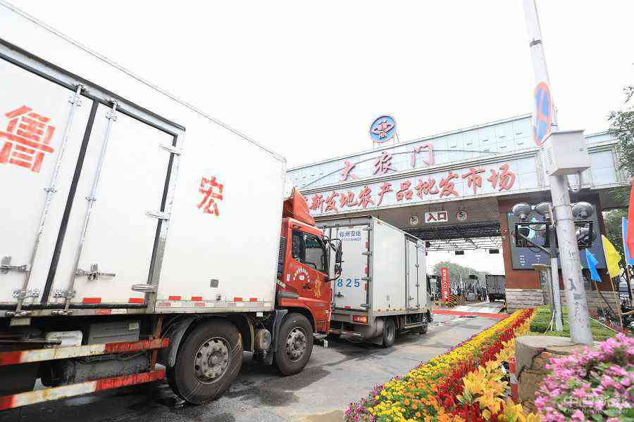 8月15日早上7點(diǎn)38分,滿載水果蔬菜的貨車一輛輛駛?cè)胄掳l(fā)地市場(chǎng)大農(nóng)門。(攝影:王成孟)