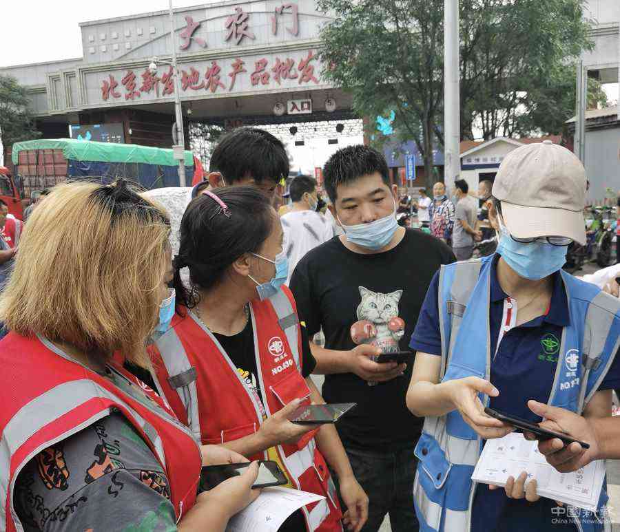 8月15日一早,新發(fā)地市場(chǎng)的商戶們排隊(duì)有序接受人臉識(shí)別和體溫檢測(cè)。(攝影:王成孟)