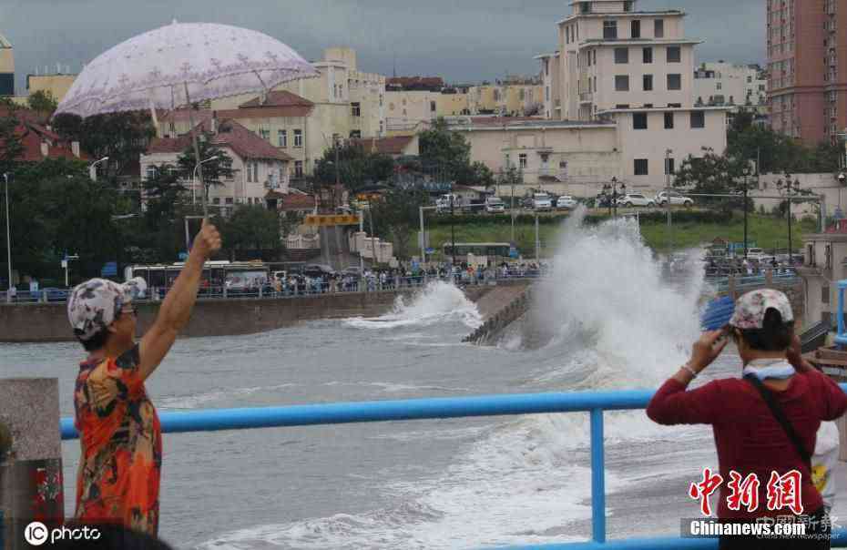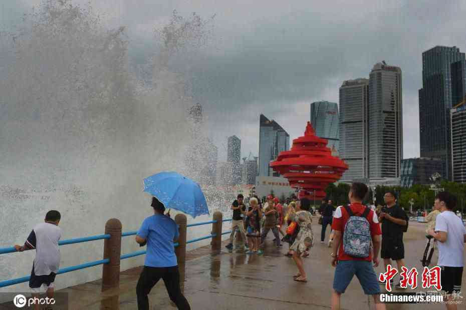 8月26日,人們?cè)谏綎|青島棧橋海域觀賞大浪。圖片來(lái)源:ICphoto