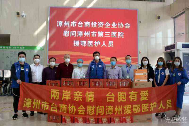 圖:福建省漳州市臺商日前來到漳州市第三醫(yī)院、正興醫(yī)院,為漳州“援鄂”醫(yī)護(hù)人員送上食品慰問物資\中新社