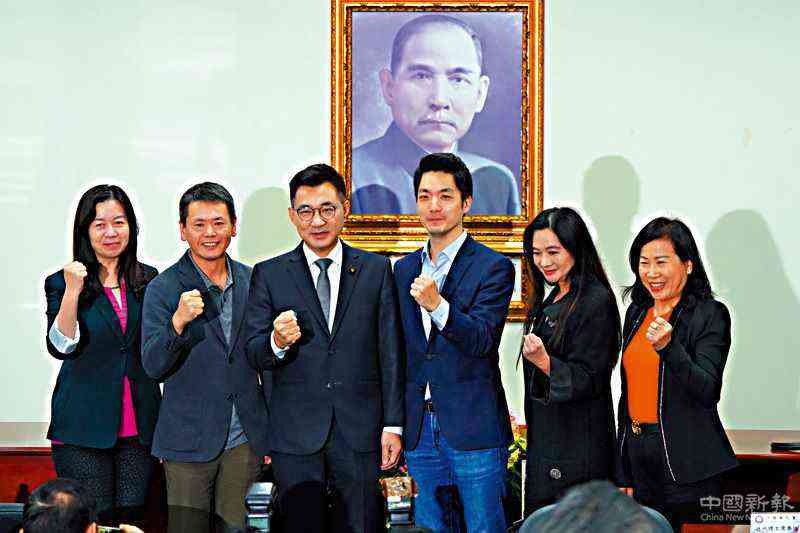 圖:國(guó)民黨立院黨團(tuán)總召林為洲(左2)、書記長(zhǎng)蔣萬安(右3)等人與新任黨主席江啟臣(左3)合影\中央社