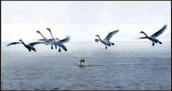 百轉(zhuǎn)千鳴,看天鵝們“回家”,無不演繹對“鳥類天堂”黃陂湖的眷念。在水一方,目睹天鵝快速游動、追趕食物,在嚴(yán)寒中不時翻著跟頭到水中覓食。它們時而嬉戲、時而飛翔,發(fā)出“呀、呀”的呼喚聲。此岸到彼岸,千姿百態(tài)的天鵝,一邊表演“I舞、C舞”,一邊若隱若現(xiàn)于廣袤的仙境之中。