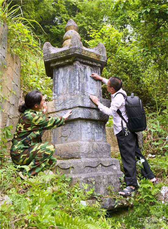 進(jìn)入庵堂,首先映入眼前的是正門上方鑲嵌著新寧縣人民政府字樣的縣級(jí)文物保護(hù)石刻該庵堂依山而建,占地約400平方米,全是土磚重建砌成,內(nèi)有2塊大石碑,記錄著重建時(shí)捐款人的名字,庵內(nèi)雕像十分簡(jiǎn)單,光線暗淡,無(wú)從拍照,看興茫然,后隨女主人來(lái)到庵堂后山,看到了讓人驚艷的遠(yuǎn)古塔碑(見(jiàn)圖三),該塔碑高2.86米,造型別致高雅,飛禽走獸雕刻十分講究,應(yīng)屬當(dāng)時(shí)朝廷顯赫一時(shí)的人物。由于字跡不清,通過(guò)水與毛巾擦拭,慢慢辯認(rèn),希望能夠從中找到有歷史價(jià)值的文字,遺憾的是,看了半天,只看清了“雍政皇朝”、“第三十五代和尚”、“上廣下徹”等字樣,探古沒(méi)有一點(diǎn)進(jìn)展。中午,在鄭桂花老師家中就餐,希望能夠向當(dāng)?shù)乩先酸娫L到更多的遠(yuǎn)古傳聞,閑聊后,得到的答案,只是幾個(gè)未解的謎團(tuán)。