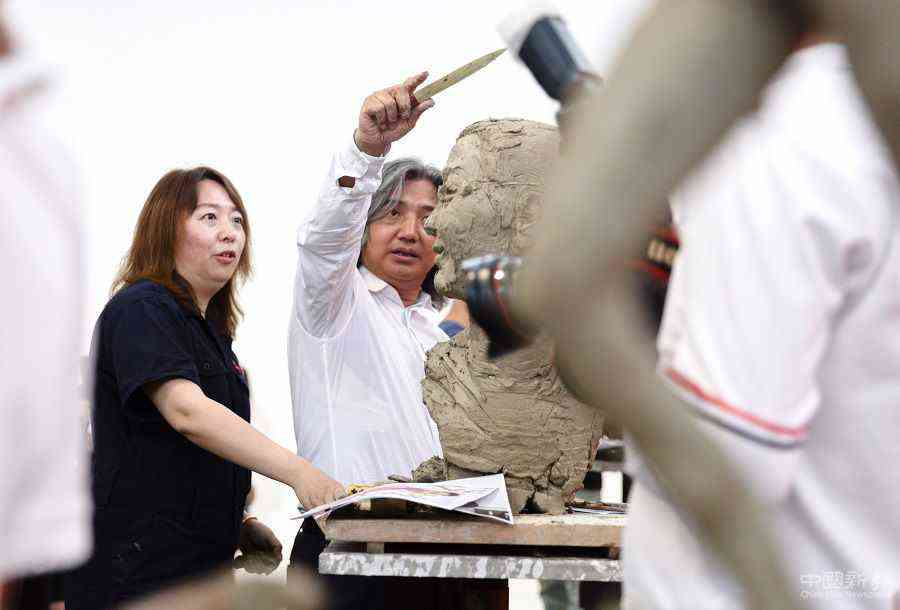 8月28日,全國政協(xié)常委、中國美術(shù)館館長、中國美術(shù)家協(xié)會副主席吳為山(中)在現(xiàn)場指導(dǎo)雕塑家為黃文秀塑像。 中國日報(bào)記者 姜東 攝