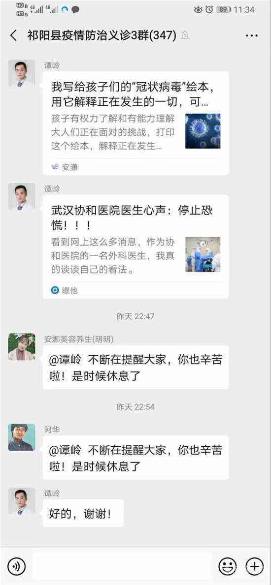 愛人不在身邊,親人隨風(fēng)而逝。譚嶺將滿腔的“愛”意投入到疫情防控工作中去??吹饺珖?guó)上下老百姓對(duì)武漢新冠肺炎疫情的恐慌,身為耳鼻喉主任醫(yī)師的他主動(dòng)邀請(qǐng)祁陽醫(yī)療系統(tǒng)副主任以上職稱的醫(yī)師建立微信義診群9個(gè),為普通百姓尤其是武漢返鄉(xiāng)人員宣傳防控知識(shí),解答各種不適的應(yīng)對(duì)方法,受益群眾達(dá)五千余人。