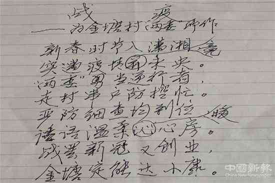 中國新報(特約記者 鄧和明 通訊員 李詩華)“新春時節(jié)入瀟湘,突遇疫情竟未央。兩委勇當逆行者,走村串戶防控忙。嚴防細查均到位,話語溫柔暖心房。戰(zhàn)罷新冠又創(chuàng)業(yè),金塘定能達小康。”3月16日,正在嘉禾縣龍?zhí)舵?zhèn)金塘村村級活動活動中心值班的胡平美收到了一份特殊的禮物——一首手寫詩。