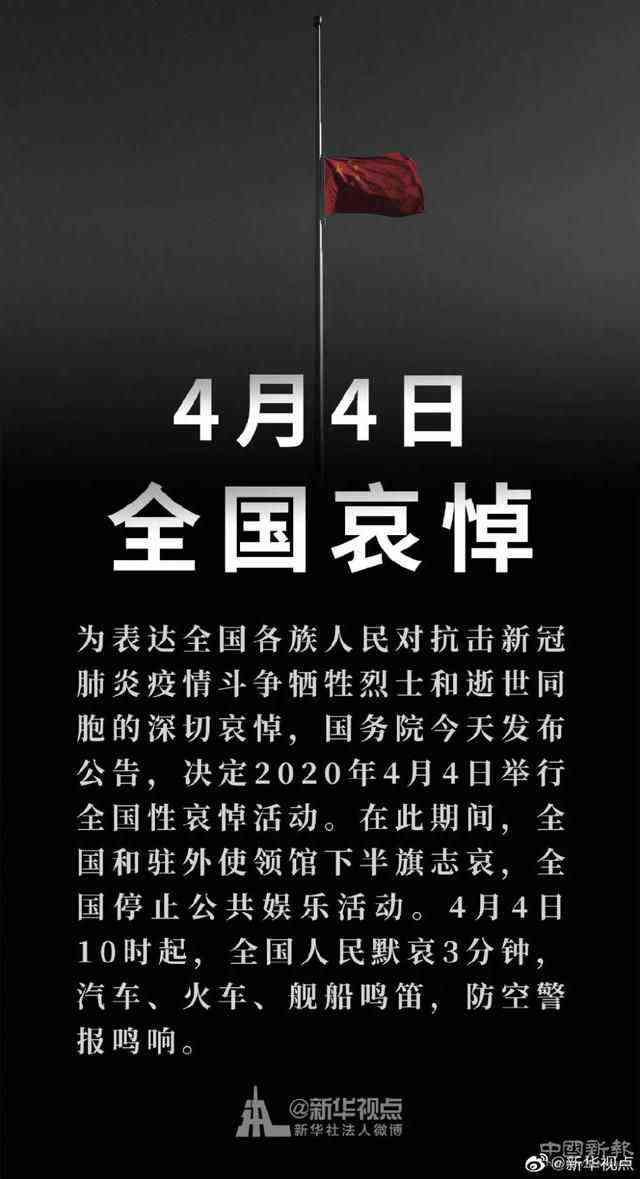 為表達全國各族人民對抗擊新冠肺炎疫情斗爭犧牲烈士和逝世同胞的深切哀悼,國務院今天發(fā)布公告,決定2020年4月4日舉行全國性哀悼活動。在此期間,全國和駐外使領館下半旗志哀,全國停止公共娛樂活動。4月4日10時起,全國人民默哀3分鐘,汽車、火車、艦船鳴笛,防空警報鳴響。