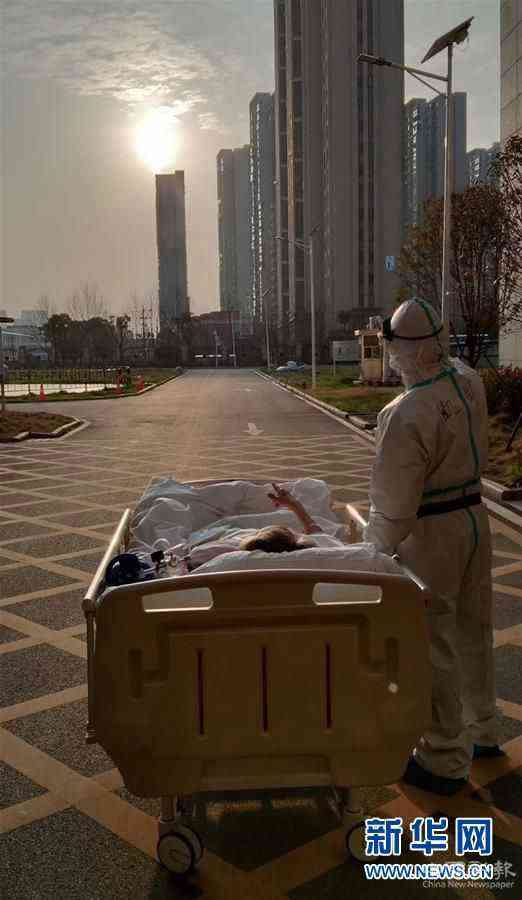 3月5日傍晚,在武漢大學(xué)人民醫(yī)院東院,復(fù)旦大學(xué)附屬中山醫(yī)院支援湖北醫(yī)療隊(duì)的劉凱在護(hù)送患者做CT的途中停下,讓住院近一個(gè)月的87歲老人欣賞久違的日落。 新華社發(fā)(甘俊超 攝)