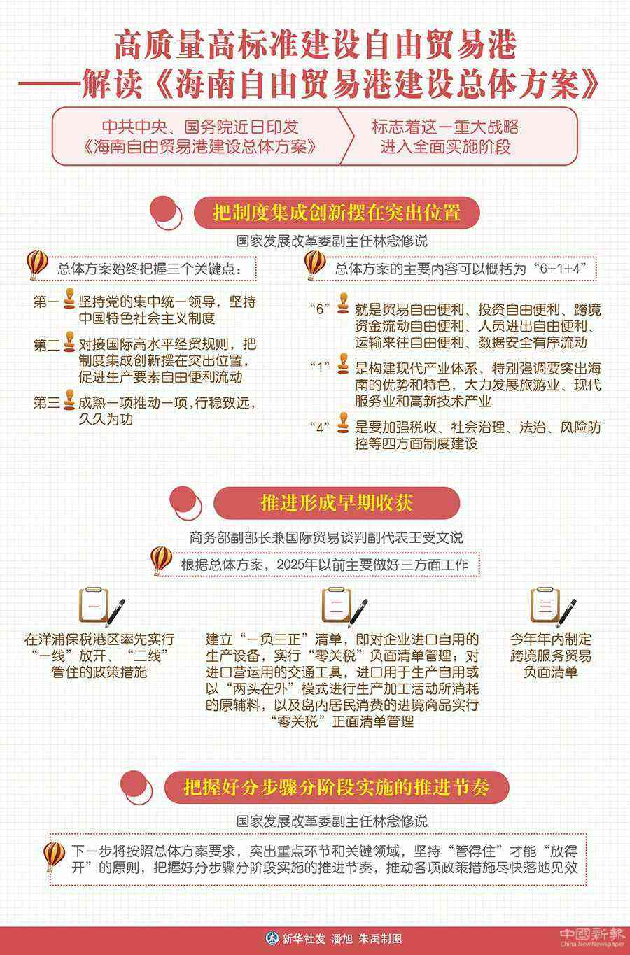 林念修說,總體方案的主要內(nèi)容可以概括為“6+1+4”。“6”就是貿(mào)易自由便利、投資自由便利、跨境資金流動(dòng)自由便利、人員進(jìn)出自由便利、運(yùn)輸來往自由便利、數(shù)據(jù)安全有序流動(dòng);“1”是構(gòu)建現(xiàn)代產(chǎn)業(yè)體系,特別強(qiáng)調(diào)要突出海南的優(yōu)勢和特色,大力發(fā)展旅游業(yè)、現(xiàn)代服務(wù)業(yè)和高新技術(shù)產(chǎn)業(yè);“4”是要加強(qiáng)稅收、社會(huì)治理、法治、風(fēng)險(xiǎn)防控等四方面制度建設(shè)。