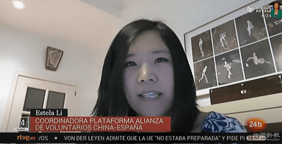 李婭接受西班牙國家電視臺采訪的視頻截圖。(“全球抗疫志愿者聯(lián)盟”提供)