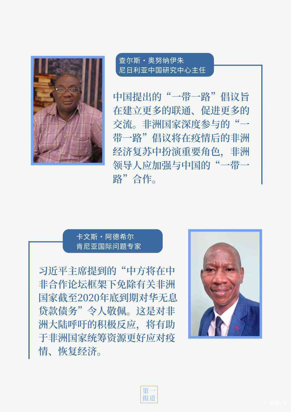在不久前舉行的第73屆世界衛(wèi)生大會(huì)視頻會(huì)議開(kāi)幕式上,習(xí)主席承諾,中國(guó)將同二十國(guó)集團(tuán)成員一道落實(shí)“暫緩最貧困國(guó)家債務(wù)償付倡議”。在此次峰會(huì)上,習(xí)主席明確表示,中方將在中非合作論壇框架下免除有關(guān)非洲國(guó)家截至2020年底到期對(duì)華無(wú)息貸款債務(wù),同國(guó)際社會(huì)一道,加大對(duì)疫情特別重、壓力特別大的非洲國(guó)家的支持力度,包括進(jìn)一步延長(zhǎng)緩債期限。